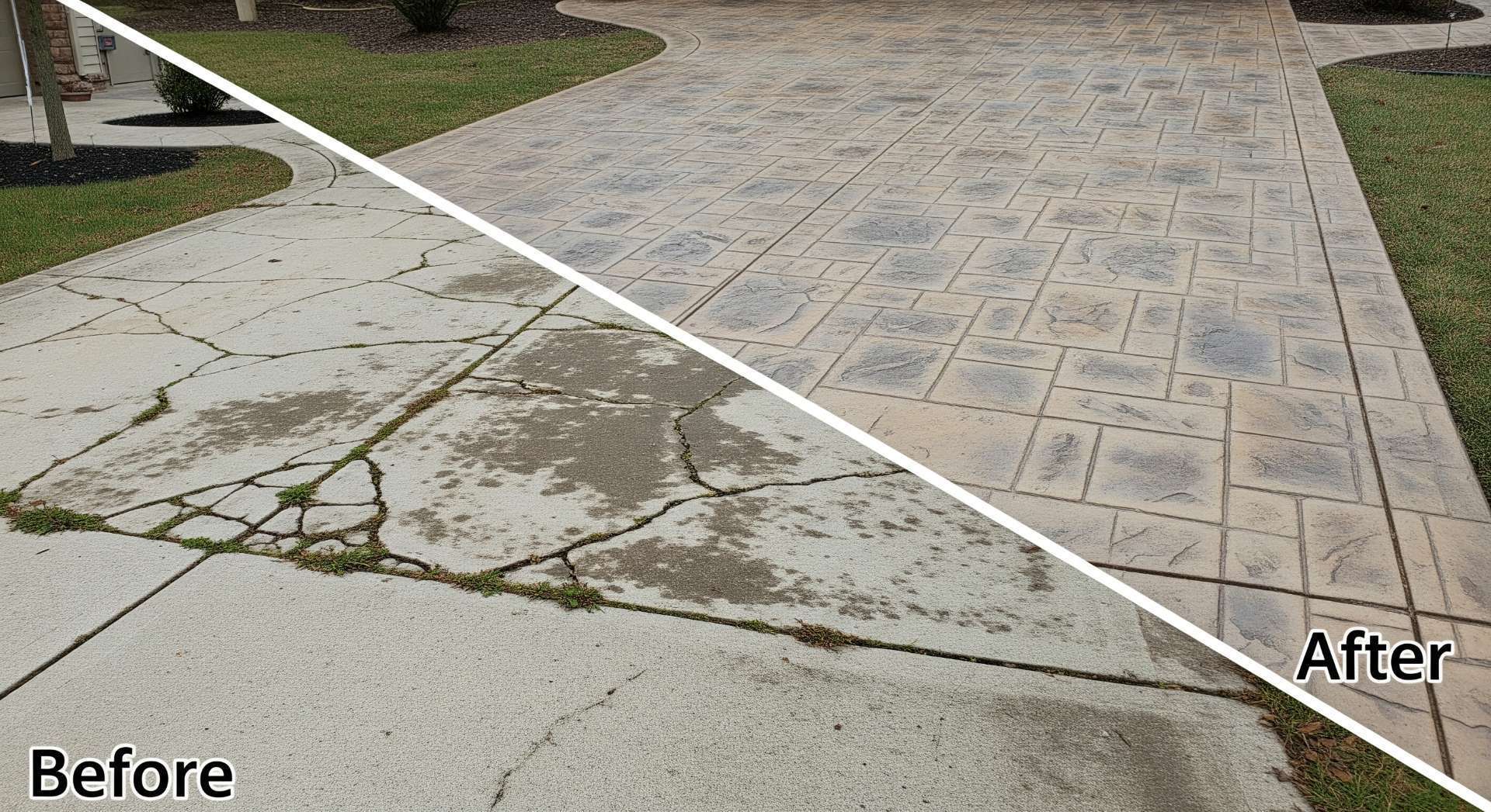 最も一般的なリフォーム例です。高圧洗浄で汚れを落とし、プライマー(接着剤)を塗布、その上からスタンプコンクリートを施工します。ひび割れていた無機質なコンクリートが、高級感のある石畳やレンガ調の美しいデザインに生まれ変わります。